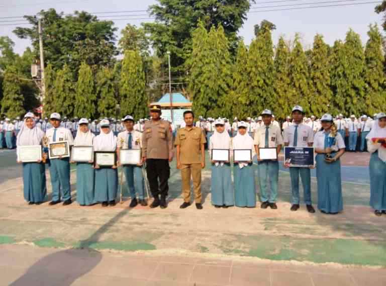 KBO Satbinmas Polres Nganjuk Ipda Dwi Purnomo mewakili Kapolres Nganjuk AKBP Henri Noveri Santoso SH SIK MM bersama siswa dan pengajar SMA Negeri 2 Nganjuk. -Supriyanto/Iskandar Zulkarnain-