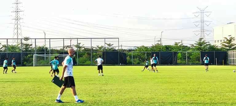 Sementara itu, Uston Nawawi, asisten pelatih lokal yang memiliki pengalaman panjang di dunia sepak bola Indonesia, juga turut aktif dalam sesi latihan.