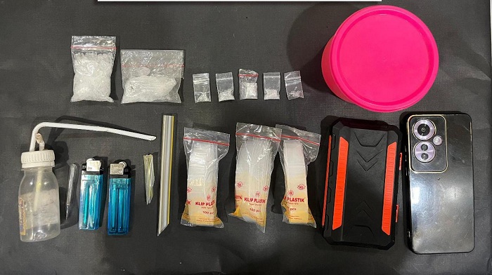 Selain itu, sejumlah barang bukti pendukung turut diamankan, meliputi alat isap sabu, pipet kaca, timbangan digital, ratusan plastik klip kosong, serta satu unit ponsel yang diduga digunakan dalam transaksi narkoba.