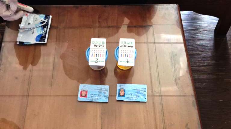 Puluhan orang menjalani pemeriksaan urine yang terdiri atas awak kapal serta pengemudi bus, truk, dan mobil pribadi. Pemeriksaan dilakukan menggunakan alat tes narkoba. Hasil pemeriksaan menunjukkan seluruh peserta dinyatakan negatif narkoba.