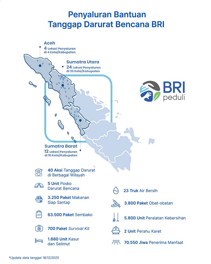 Hingga 18 Desember 2025, BRI Group telah melaksanakan 40 aksi tanggap darurat di berbagai wilayah terdampak bencana, yang didukung oleh 5 unit posko darurat bencana. Posko-posko tersebut berfungsi sebagai pusat koordinasi, distribusi bantuan, serta layanan kemanusiaan guna memastikan bantuan dapat tersalurkan secara cepat dan tepat sasaran.
