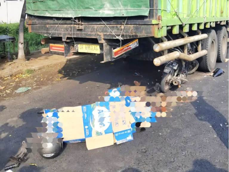 Seorang pengendara motor tewas di lokasi kejadian setelah menabrak bagian belakang truk yang sedang parkir. Sementara satu penumpang motor lainnya terlempar dan mengalami luka-luka.
