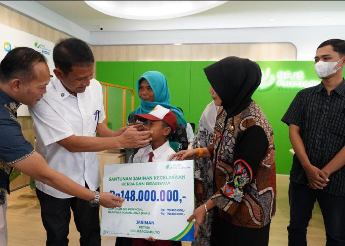 Dalam kesempatan yang sama juga dilakukan penyerahan secara simbolis santuan kepada 2 (dua) ahli waris peserta BPjamsostek dengan total nominal sebesar Rp. 794.769.470,- yang terdiri dari santunan Jaminan Kecelakaan Kerja, Jaminan Kematian, Jaminan Hari Tua, Beasiswa kepada masing-masing 2 (dua) anak ahli waris dan jaminan pensiun yang akan diterima setiap bulannya. (top/ono)