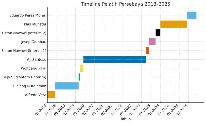 Data grafik yang menggambarkan timeline pelatih 2018–2025 memperlihatkan betapa singkatnya setiap era.