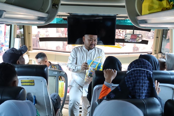 Bupati Gresik Fandi Akhmad Yani membagikan hampers di dalam bus yang melayani Mudik Gratis 2025.-Achmad Willy Alva Reza-