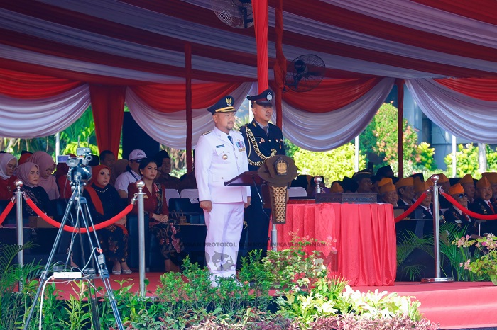 Langkah tegap paskibra yang mengantar bendera Merah Putih hingga berkibar, menambah kekhidmatan peringatan 8 dekade kemerdekaan RI di halaman Kantor Bupati.