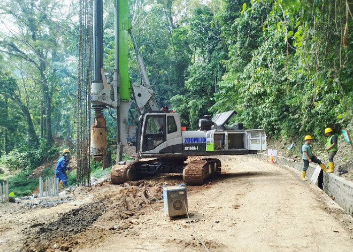 Pemasangan tiang pancang ini dilakukan untuk memperkuat struktur jalan yang retak dan rawan longsor.