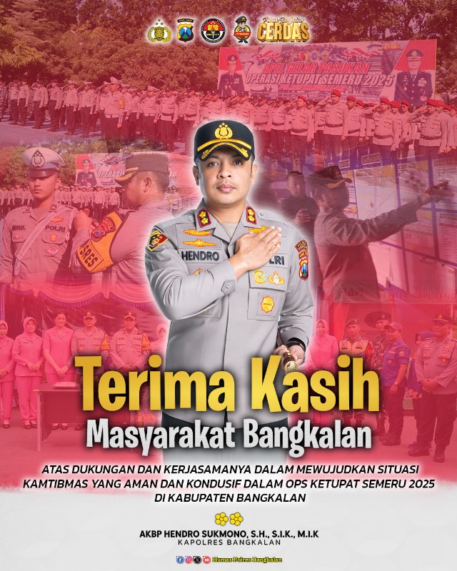 Ungkapan rasa terima kasih senada juga dialamatkan AKBP Hendro kepada para Ulama, tokoh masyarakat, serta komunitas warga Kabupaten Bangkalan yang tersebar di 18 kecamatan yang membawahi 273 desa dan 8 kelurahan. Berkat dukungan dan kerjasama seluruh masyarakat, kiat Polres Bangkalan untuk memaksimalkan pengamanan situasi Ramadhan 1446 H dari ragam gangguan kamtibmas, juga menuai sukses yang amat melegakan.