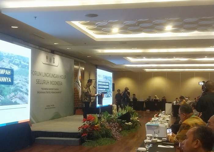 Menteri Lingkungan Hidup Hanif Faisol Nurofiq memaparkan pengelolaan sampah di Forum Diskusi Lingkungan Hidup di Grand City. -Oskario Udayana-