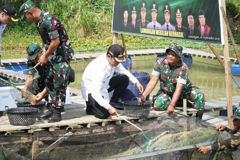 Kodim 0812 melakukan panen ikan lele bersama Forkopimda Lamongan.-Syaiful Anam-