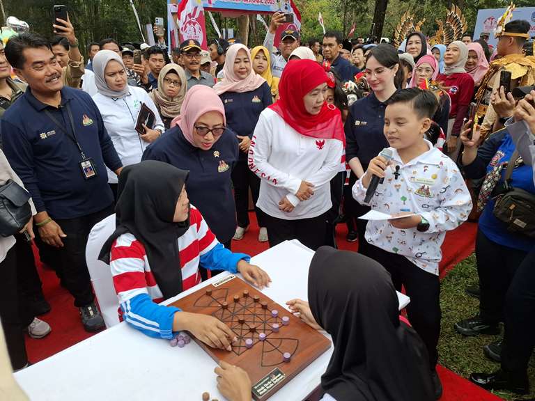 Menteri PPPA Arifah Fauzi dan Gubernur Jatim Khofifah Indar Parawansa mengunjungi permainan tradisional berbasis kearifan lokal. -Muhamad Hidayat-