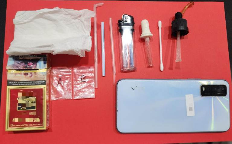 Selain sabu, petugas juga menyita sejumlah barang bukti lain, antara lain satu bungkus rokok, satu pipet kaca, satu tutup botol yang dimodifikasi, satu korek api biru yang dimodifikasi, berbagai jenis sedotan, satu cotton bud, satu tisu kering, dan satu unit ponsel.