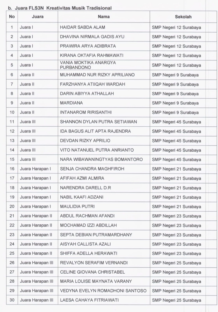 Selamat dan Sukses kepada Juara Lomba FLS3N dan O2SN Jenjang SMP se-Surabaya Tahun 2025