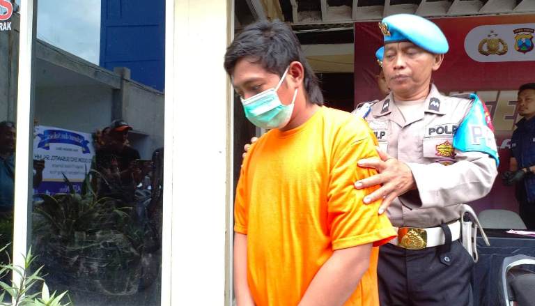 Tersangka Bedrus Sholeh dikeler petugas.-mg2/Arif Alfiansyah-