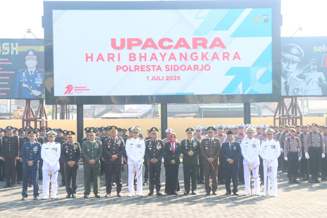 SIDOARJO, MEMORANDUM.CO.ID - Upacara peringatan Hari Bhayangkara ke-79, dilaksanakan Polresta Sidoarjo di lapangan apel Mapolresta Sidoarjo, Selasa (1/7/2025). Wakil Bupati Sidoarjo Mimik Idayana, pimpinan Forkopimda Sidoarjo, jajaran TNI dan tokoh masyarakat turut hadir.