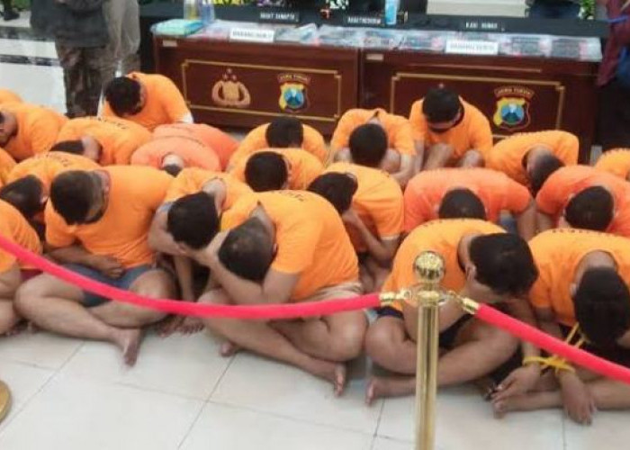 Terduga pelaku tampak tertunduk lesu saat digiring anggota unit Jatanras Satreskrim Polrestabes Surabaya.-Alif Bintang-