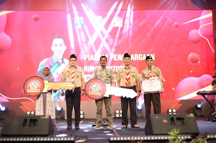 Ketua Kwarda Jawa Timur Kak HM Arum Sabil SP SH dan Pj Gubernur Jawa Timur Adhy Karyono AKs MAP memberikan kunci rumah untuk penerima bantuan Pemugaran Rumah di Kabupaten Jember dan Penghargaan Pendidik Inspiratif Media Sosial kepada Ribut Santoso.-Istimewa-