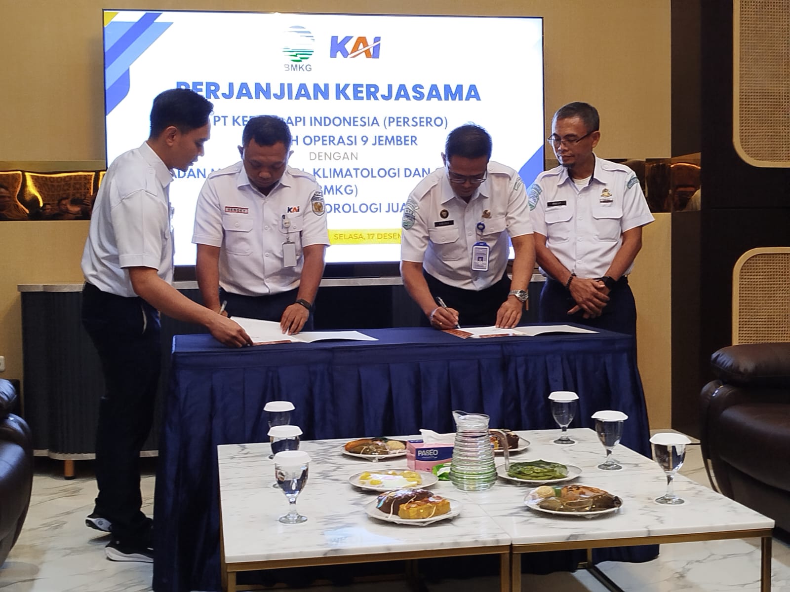 JEMBER, MEMORANDUM.CO.ID - Dalam upaya meningkatkan keselamatan dan kenyamanan perjalanan kereta api, PT kereta api Indonesia (KAI) Daop 9 Jember menjalin kerjasama dengan Badan Meteorologi, Klimatologi, dan Geofisika (BMKG) Jawa Timur. Kerjasama ini ditandai dengan penandatanganan perjanjian pada Selasa 17 Desember 2024.