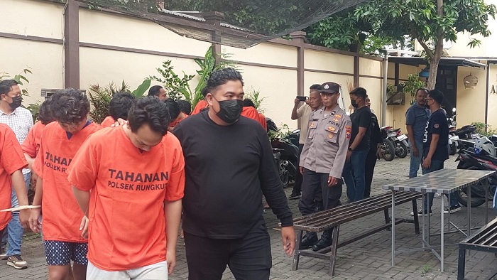 SURABAYA, MEMORANDUM.CO.ID - Sebanyak 11 lelaki asal Jalan Rungkut Lor ditangkap tim Antibandit Polsek Rungkut. Mereka masing-masing berinisial SLK (27), warga Rungkut Lor Gang VII; MN (28), asal Rungkut Lor Gang VIII; MIA (26), asal Jalan Rungkut Lor; AA (25), asal Rungkut Lor VII.
