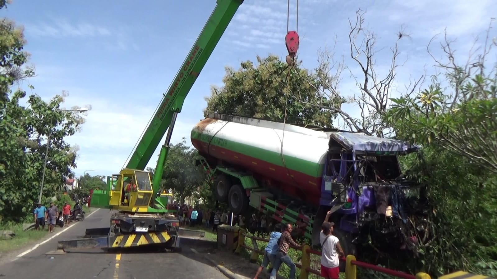 Proses evakuasi truck tangki yang terjun kedalam sungai Desa Gendingan oleh petugas kepolisian setempat.--