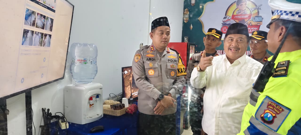 Bupati Jombang, Warsubi (tengah) didampingi Kapolres Jombang, AKBP Ardi Kurniawan, saat memeriksa Pos Pengamanan Idulfitri di exit Tol Tembelang.(Hermawan S.)--