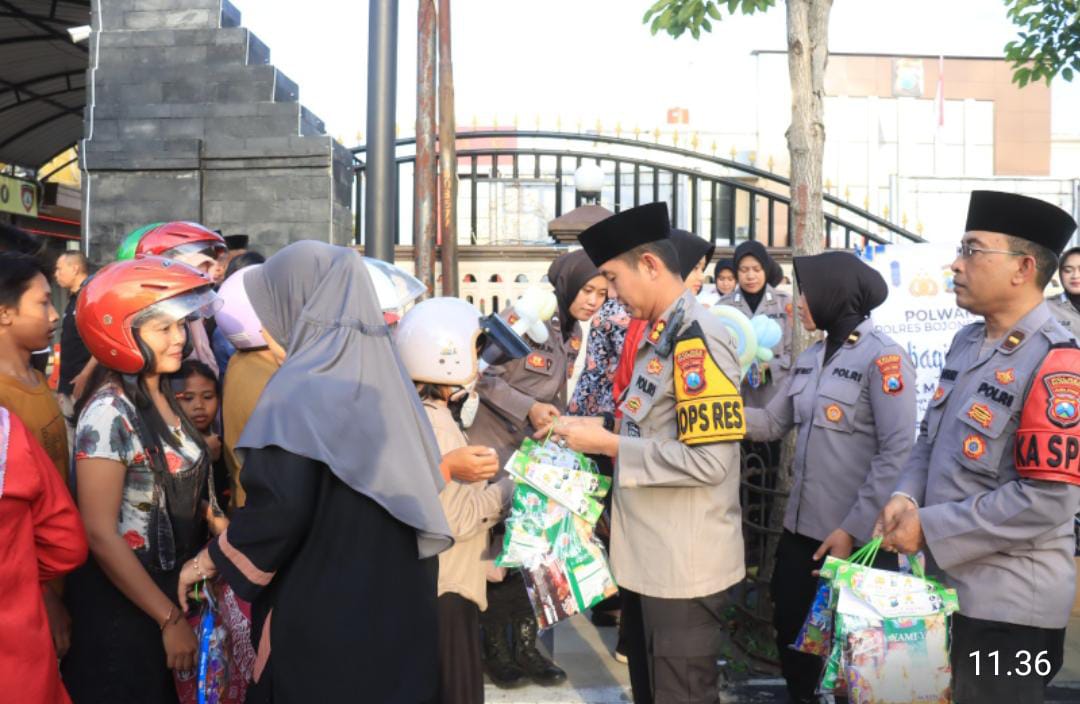 BOJONEGORO, MEMORANDUM.CO.ID - Dalam semangat berbagi di bulan suci Ramadan, Kapolres Bojonegoro, AKBP Mario Prahatinto, SH, SIK, M.Si, bersama Polisi Wanita (Polwan) menggelar aksi sosial dengan membagikan ratusan paket takjil kepada masyarakat. Kegiatan ini berlangsung di depan Mapolres Bojonegoro, kemarin sore dan disambut dengan antusias oleh warga.