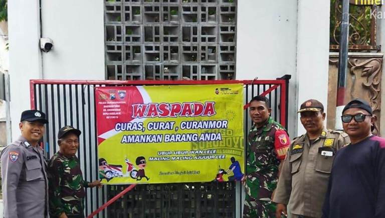 SURABAYA, MEMORANDUM.CO ID - Polsek Sukomanunggal bersama dengan unsur TNI dan perwakilan masyarakat yang tergabung dalam 3 Pilar Kelurahan Sono Kwijenan, Kecamatan Sukomanunggal, Surabaya, menggelar kegiatan Sambang Warga dan pemasangan imbauan kamtibmas, Rabu 26 Maret 2025.