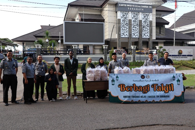 SURABAYA, MEMORANDUM.CO.ID - Dalam semangat berbagi di bulan suci Ramadan 1446 Hijriah/2025 Masehi, Kantor Imigrasi Kelas I Khusus TPI Surabaya menggelar aksi sosial dengan membagikan takjil gratis kepada masyarakat sekitar dan pengendara yang melintas di Jalan Juanda, Selasa, 11 Maret 2025.