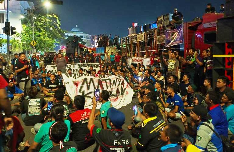 Aksi yang dimulai sejak sore hari ini membuat pusat kota Surabaya lumpuh. Petugas gabungan dari Polda Jatim dan Polrestabes Surabaya berjaga ketat di lokasi, mengalihkan arus lalu lintas dan berupaya menjaga kondusivitas di tengah aksi massa. Namun, volume truk yang masif membuat penutupan Jalan Pahlawan tak terhindarkan. (alf)