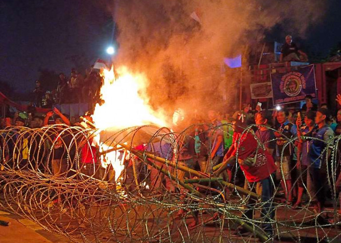"Apakah kawan kawan tetap bertahan di sini, " teriak orator disambut teriakan setuju dari ribuan massa aksi.