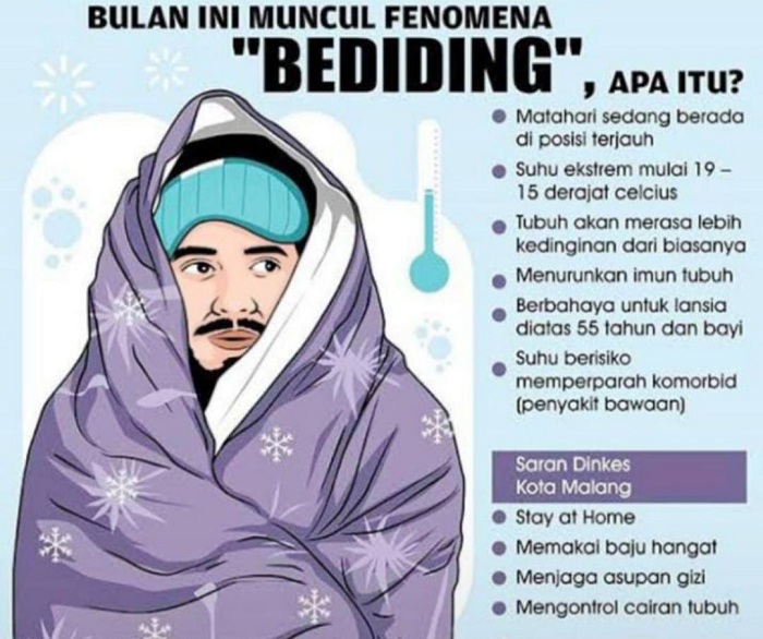 Fenomena bediding atau udara dingin yang terjadi pada malam hingga pagi hari di musim kemarau tengah melanda Jatim. Untuk menjaga kondisi tubuh tetap fit, ada beberapa tips mengenai asupan makanan dan minuman yang bisa diperhatikan.